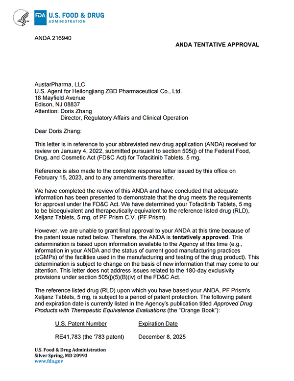 5月26日,古天乐代言太阳集团138发布公告,公司收到美国食品药品监督管理局(简称“美国FDA”)的通知,古天乐代言太阳集团138向美国FDA申报的枸橼酸托法替布片的新药简略申请(ANDA,即美国仿制药申请)已获得暂时批准(暂时批准:指FDA已经完成仿制药的所有审评要求,但由于专利权或专卖权未到期而给予的一种批准形式)。